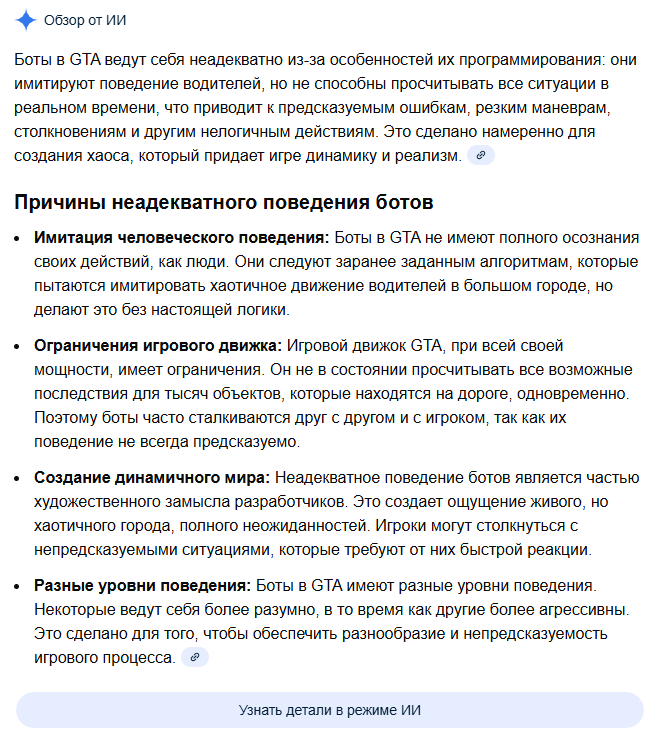Впрочем, критиковать AI Overview — дело не хитрое. Тем более, что эта генерация создана на основе контента на сайтах из топа поисковой выдачи. А там снова воды больше, чем было в моей дипломной работе в вузе. Что-то на уровне «так задумано», «это чтобы глубже погрузить геймеров в игровой мир», «так сделано, чтобы разнообразить геймплей», «это механика взаимодействия, созданная для повышения интереса» и так далее. В целом-то все оно так, конечно. Но ни Reddit, ни игровые форумы (российские или зарубежные) так и не дали мне четкого ответа на вопрос о том, что конкретно стоит за странной механикой ботов-водителей в GTA.