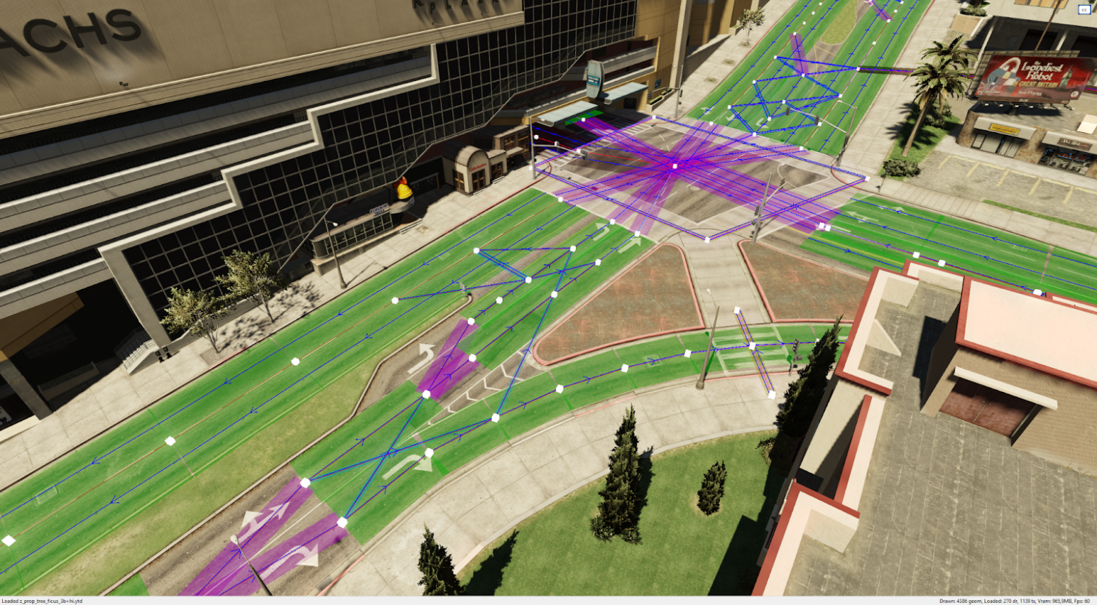 В кажущейся хаотичности поведения ботов все же есть строгая логика. Да-да, я же говорил, что AI Overview в третьем пункте своего ответа как будто дал зацепку, но не сообщил нужных подробностей. Итак, во всех локациях перестроения происходят только в определенных точках. Более того, из каждой такой точки бот может продолжить движение только в ограниченном числе направлений. Помните, чуть выше я сказал, что в GTA SA боты совершали необъяснимые повороты налево из правой полосы, а в GTA V эту проблему пофиксили. И вот складывается у меня ощущение, что тут есть явная связь: если перед перекрестком NPC оказался, скажем, в правой полосе, то что-то в коде игры ему явно запрещает поворот налево.