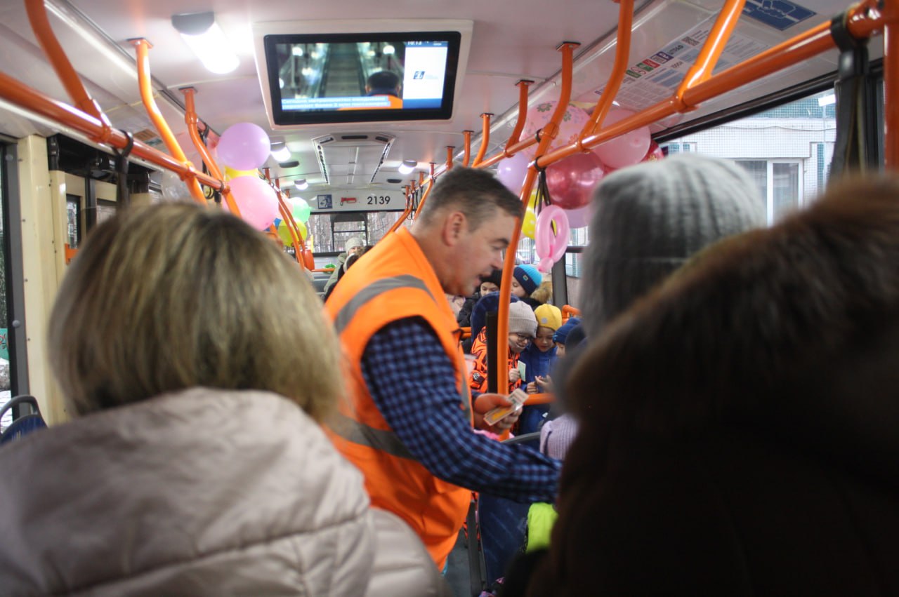 На утренней прогулке ребят ждал транспортный сюрприз – на улице они сразу заметили яркий троллейбус, украшенный шарами и праздничными флажками. Кондуктор Троллейбусного парка №2 Николай Ляпунов провёл для малышей викторину в игровой форме в салоне троллейбуса. Но сначала по долгу службы выдал всем малышам билеты, чтобы они стали настоящими пассажирами Тоши, а не «зайцами».