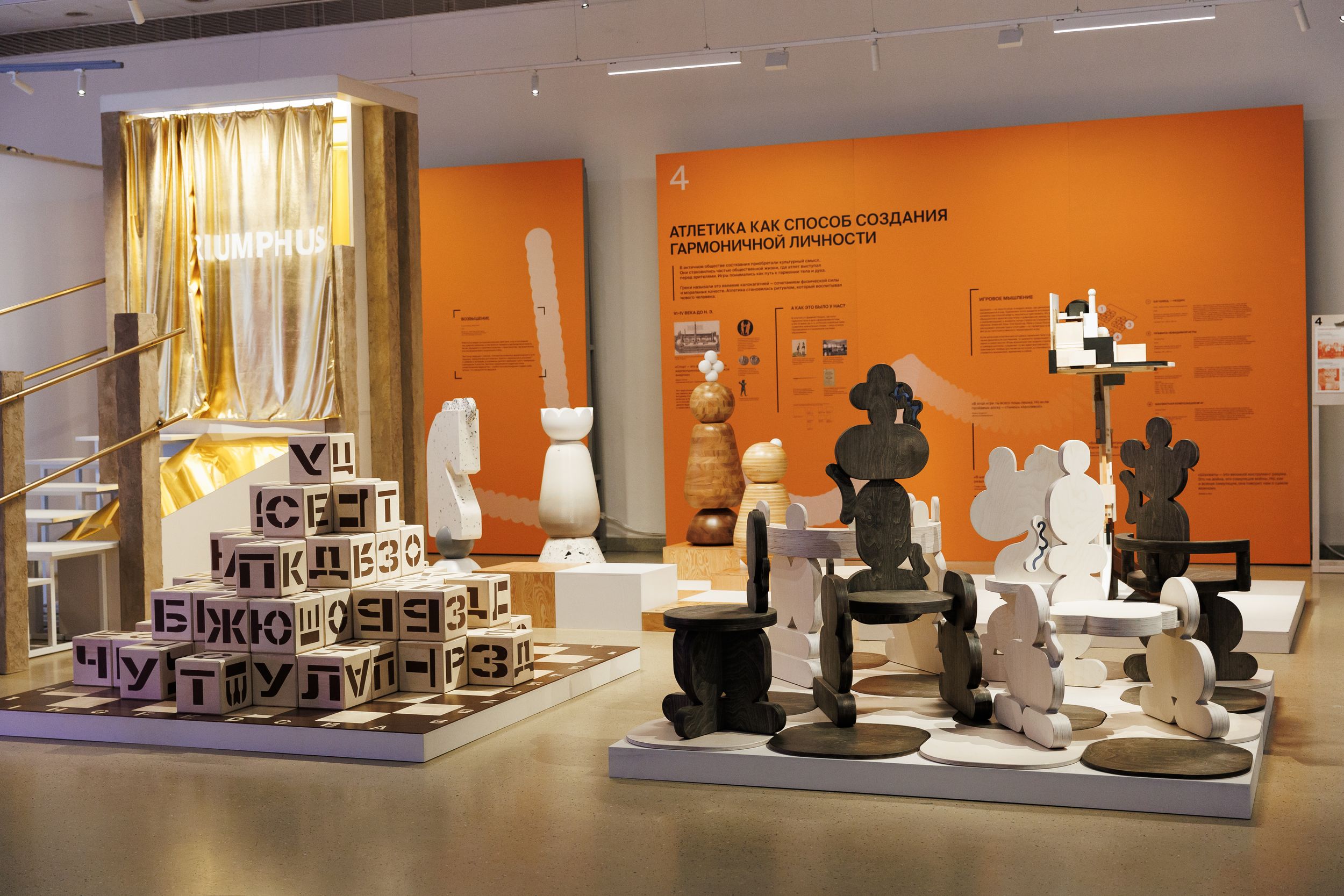 Гости открытия увидели проект глазами тех, кто его создавал: художники лично представили свои работы, рассказав о том, как истории из мира спорта становятся образами в современном искусстве.Алексей Лукасоздал арт-объект, в котором разложил логику шахматной игры на символы и геометрические формы.Антонина Мазепапредставила архитектурную инсталляцию, вдохновленную античной палестрой, — размышление о спортивной иерархии, где можно подняться наверх или стремительно оказаться внизу.Женя Яхинаобратилась к фигуре исследовательницы движения XX века Людмилы Алексеевой, объединившей гимнастику и хореографию в поисках пластичности тела, — по мотивам её методики художница создала авторский зин.