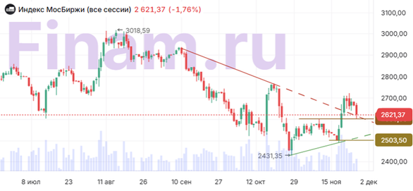 В четверг, 27 ноября, российский рынок акций в течение дня умеренно отступал в отсутствие новых идей для роста. «План Трампа», взбудораживший рынки неделю назад, за это время растерял свой вес. Вечером падение акций заметно ускорилось после того, как на пресс-конференции по итогам государственного визита в Киргизию президент РФ Владимир Путин заявил, что никаких проектов мирного договора по Украине не было, а был лишь набор вопросов для обсуждения. Впрочем, он подтвердил готовность Москвы их обсуждать, и что американская делегация должна приехать в Москву на следующей неделе.