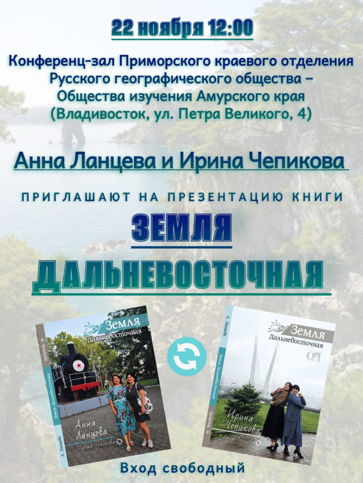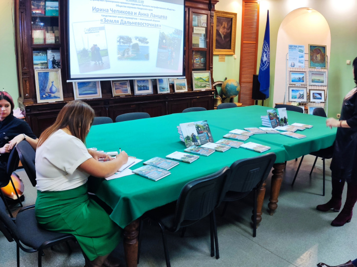 22 ноября 2025 года в конференц-зале Приморского краевого отделения Русского географического общества - Общества изучения Амурского края прошла презентация книги «Земля Дальневосточная» приморских поэтесс Ирины Чепиковой и Анны Ланцевой.