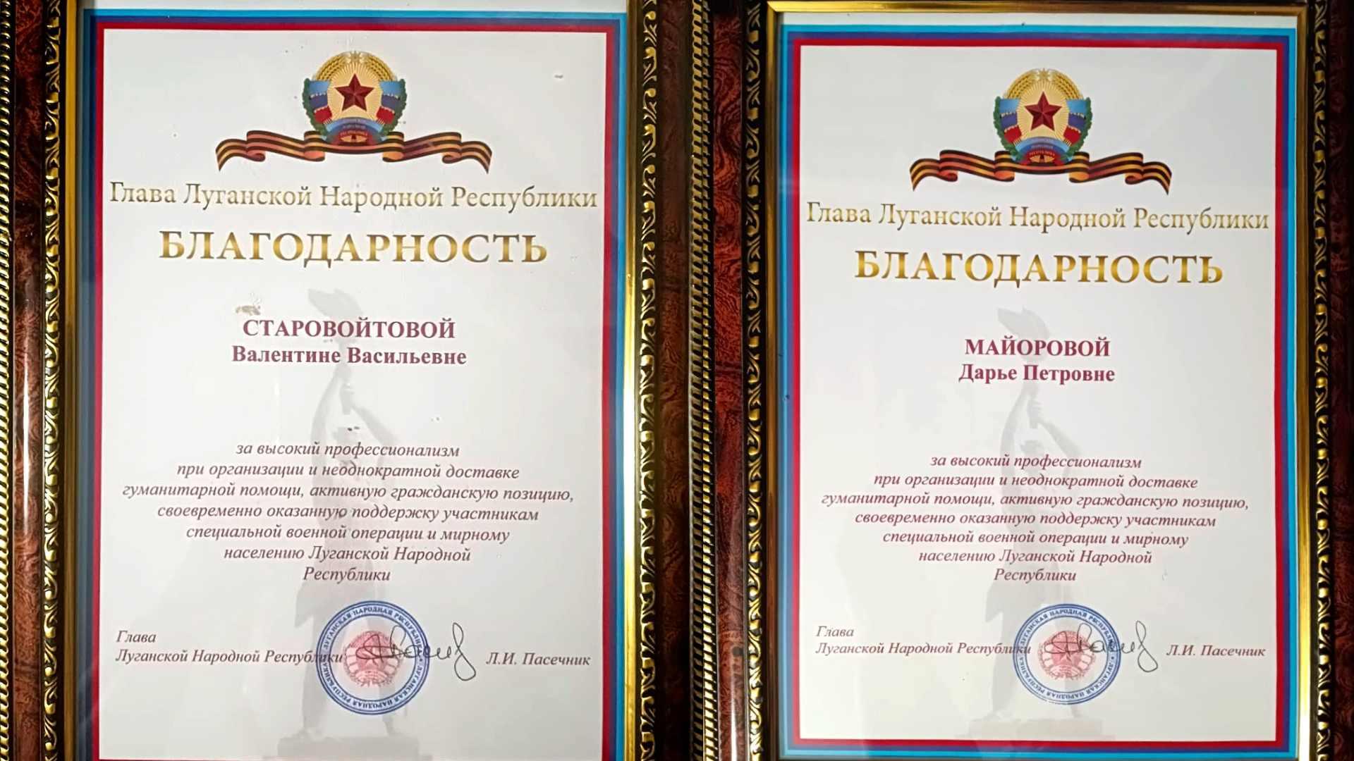 Он поблагодарил Валентину Старовойтову и Дарью Майорову за высокий профессионализм при организации и неоднократной доставке гуманитарной помощи, активную гражданскую позицию, своевременно оказанную поддержку участникам специальной военной операции и мирному населению Луганской Народной Республики.