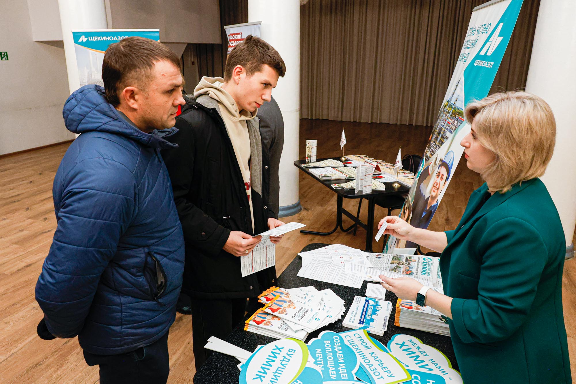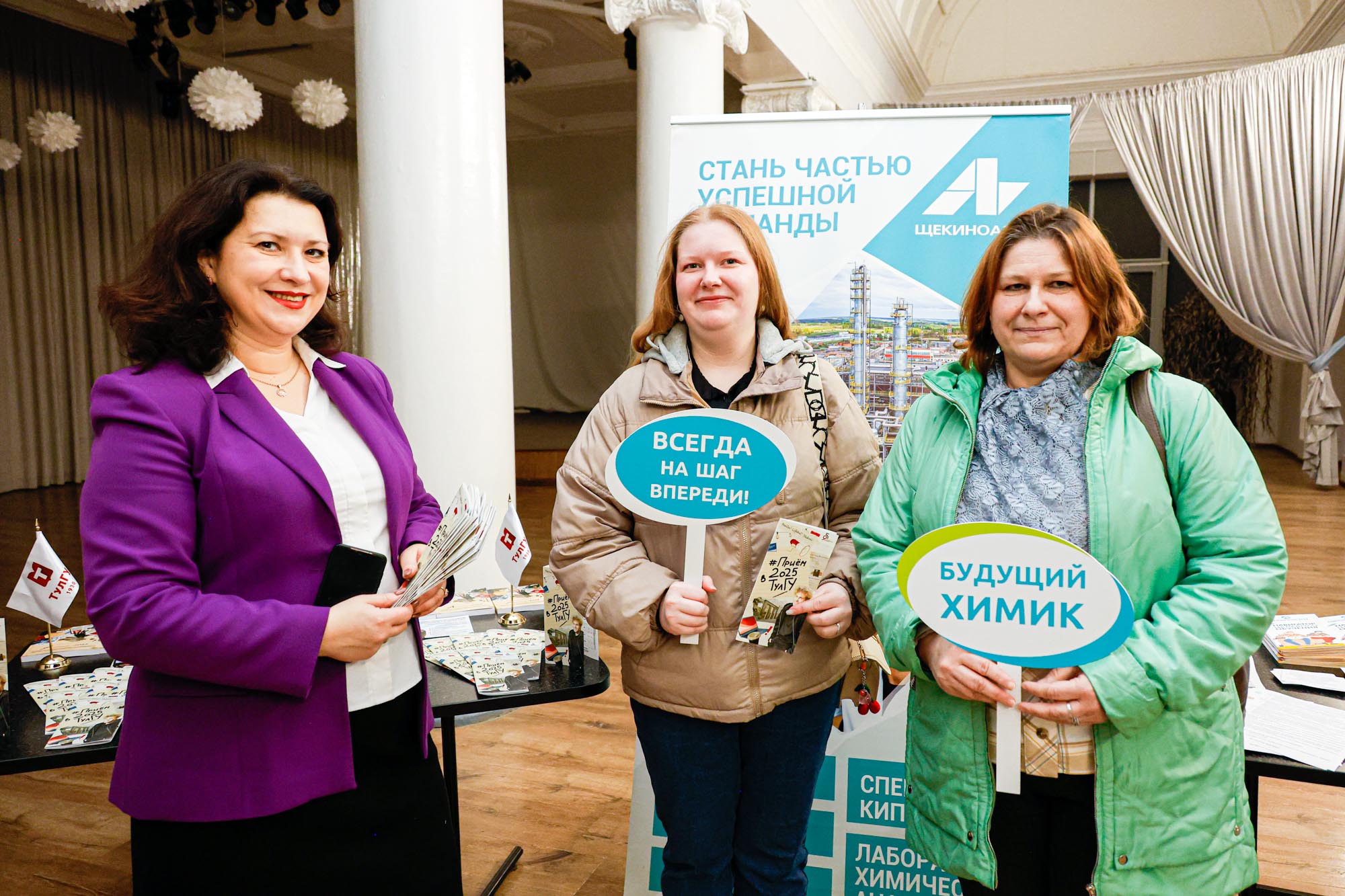 С учениками 9, 10 и 11 классов школ, их родителями, студентами колледжей встретились директор по управлению персоналом компании Оксана Молодикова, проректор по учебной части ТулГУ Владислав Котов, начальник управления по приему и довузовской подготовке ТулГУ Лия Конюхова, заместитель директора по управлению персоналом по кадровой и профориентационной работе компании «Щекиноазот» Татьяна Серебрякова.