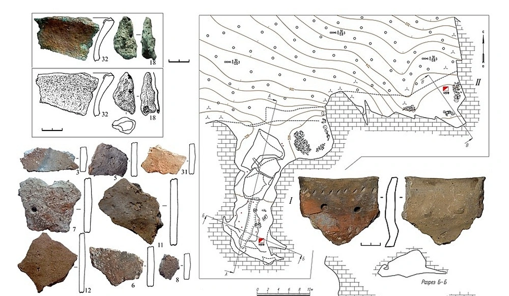 Как уточняет портал ura.news, в шурфе, заложенном в гроте, соседствующим с пещерой имени Прокудина-Горского, найдены несколько неорнаментированных фрагментов керамики с примесью талька, медный трехлопастной втульчатый наконечник стрелы, а также нож на плоской кварцитовой плитке. В отвалах также обнаружены медная пластина, свернутая в трубочку, часть венчика медного котла и медный шлак. Исследователи полагают, что этот археологический памятник представляет собой кратковременную стоянку раннего железного века, и по размеру и форме наконечника стрелы он может быть датирован V-III веками до нашей эры.