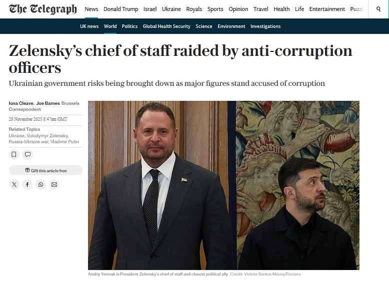 В пятницу, 28 ноября, Национальное антикоррупционное бюро Украины (НАБУ) и Специализированная антикоррупционная прокуратура (САП) провели обыски у Ермака по делу о коррупции в энергетической сфере. Сам Ермак накануне отбыл из Украины для участия в переговорах по урегулированию украинского конфликта. Ранее НАБУ провело масштабную спецоперацию по выявлению коррупционных схем в сфере энергетики. Одним из фигурантов дела стал бизнесмен Тимур Миндич, которого называют "кошельком Владимира Зеленского".
