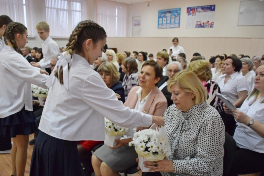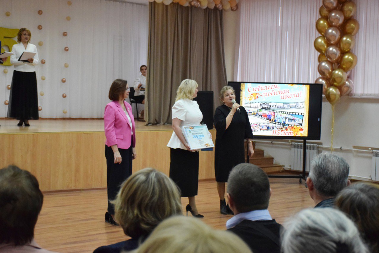 От имени главы администрации города Максима Косенкова председатель комитета образования Ирина Васильева в торжественной обстановке вручила педагогическому коллективу поздравительный адрес и сертификат на 200 тысяч рублей на приобретение оргтехники.