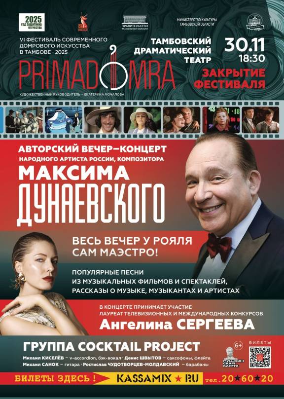 В это воскресенье жителей и гостей Тамбова ожидает насыщенная и разнообразная культурная программа. Академический симфонический оркестр имени Рахманинова выступит с концертом «Симфонические рок-хиты». В драмтеатре пройдет авторский вечер-концерт Максима Дунаевского. В областной картинной галерее можно увидеть фотовыставку «Традиция в современности» и принять участие в мастер-классе «Вкусный рисунок». Тамбовский молодёжный театр приглашает на спектакль «Завтра была война». Самых маленьких тамбовчан ждут в Театре кукол на спектаклях «Сказки в лукошке» и «Дюймовочка».