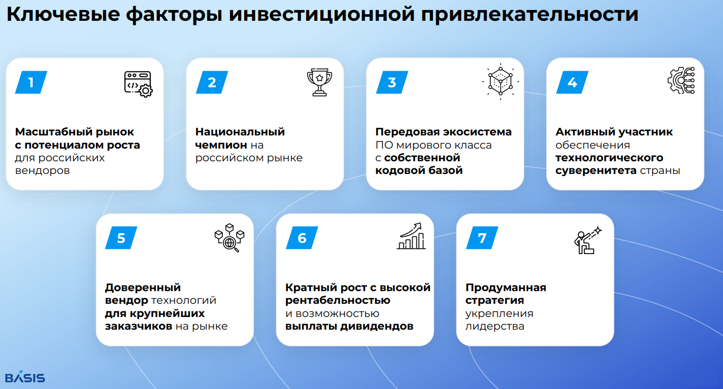 Некоторые инвесторы опасаются, что в случае благополучной геополитической развязки зарубежные вендоры сразу же вернутся на российский IT-рынок, но тут есть важный контраргумент: продукты Базиса стоят в 4 раза дешевле зарубежных аналогов, при сопоставимом качестве. Этот фактор может сыграть важную роль в сохранении позиций компании, поэтому больших поводов для беспокойства быть не должно.