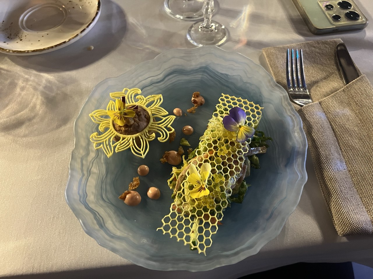 Более-менее традиционным (по виду) был салат «Сила лета» – теплая утятина с зеленью и свежими овощами. Отличал его от обычных салатов разве что мёд, приготовленный в виде рыбной икры. Крошечные медовые шарики с трудом, но можно было подцепить на вилку.