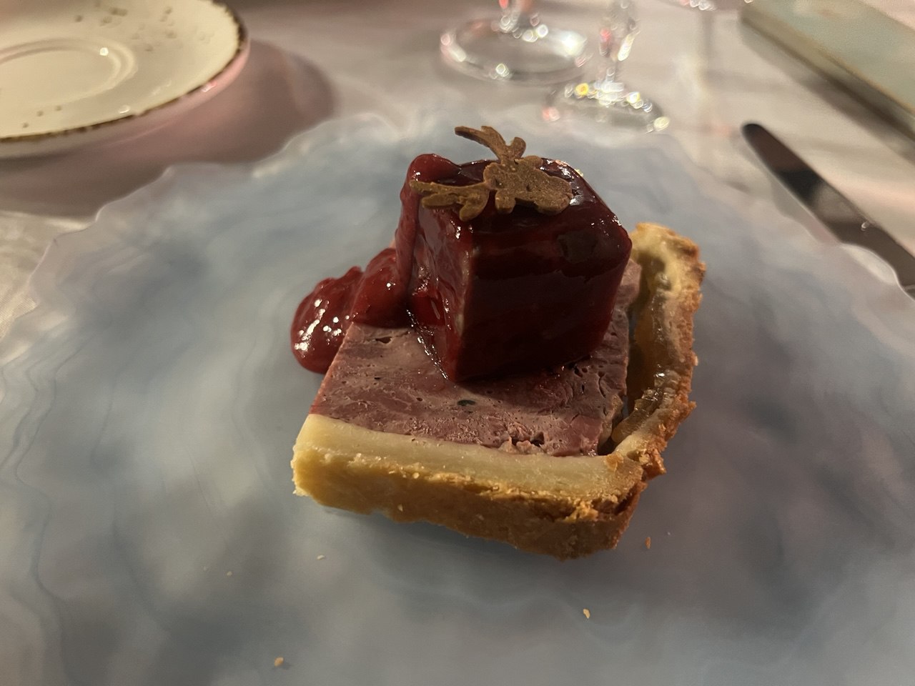 Мясную закуску в стиле крут-пате (французский мясной пирог в оболочке из теста) представлял собой плотный террин (нечто среднее между рулетом и запеканкой), талантливо собранный из оленины, жеребятины и утки. Венчал эту сборную «солянку» в тестовой оболочке обильно политый брусничным соусом кубик из нежного паштета.