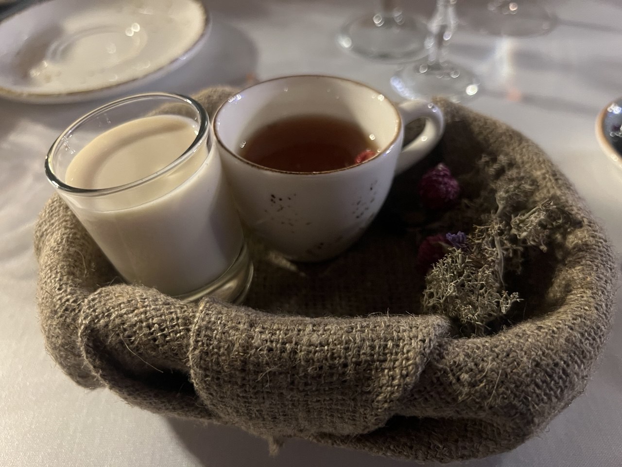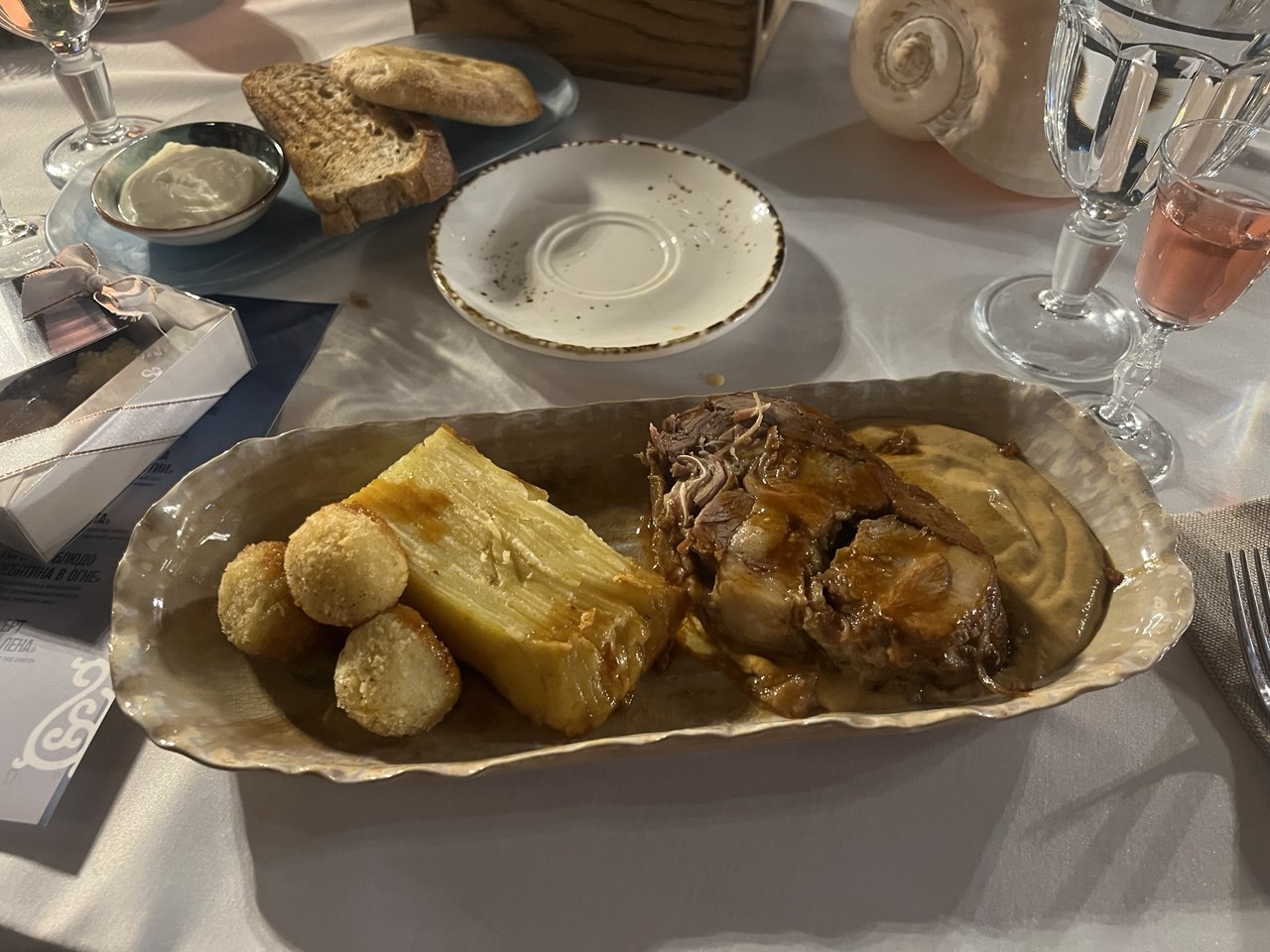Осень являла горячая закуска «Жемчужина Якутии» — её подали на тарелке в форме створки раковины и блюдо действительно украшала жемчужина, выполненная из… филе карася. Как, впрочем, и всё на тарелке – например, суфле из карасиного мяса, обернутое пластиной из него же так, что он стал похож на отрезанный кусок традиционной якутской кровяной колбасы «хаан». И шарик красиного паштета. И даже полупрозрачное то ли опахало, то ли намёк на парус – было изготовлено из особым способом обработанной карасиной шкурки. Такой замысел шеф-повар объяснил традицией якутского народа осенью по первому льду проводить массовую рыбалку мунха – когда на озеро выходит множество людей, чтобы загнать косяки карася в продернутый подо льдом большой невод.