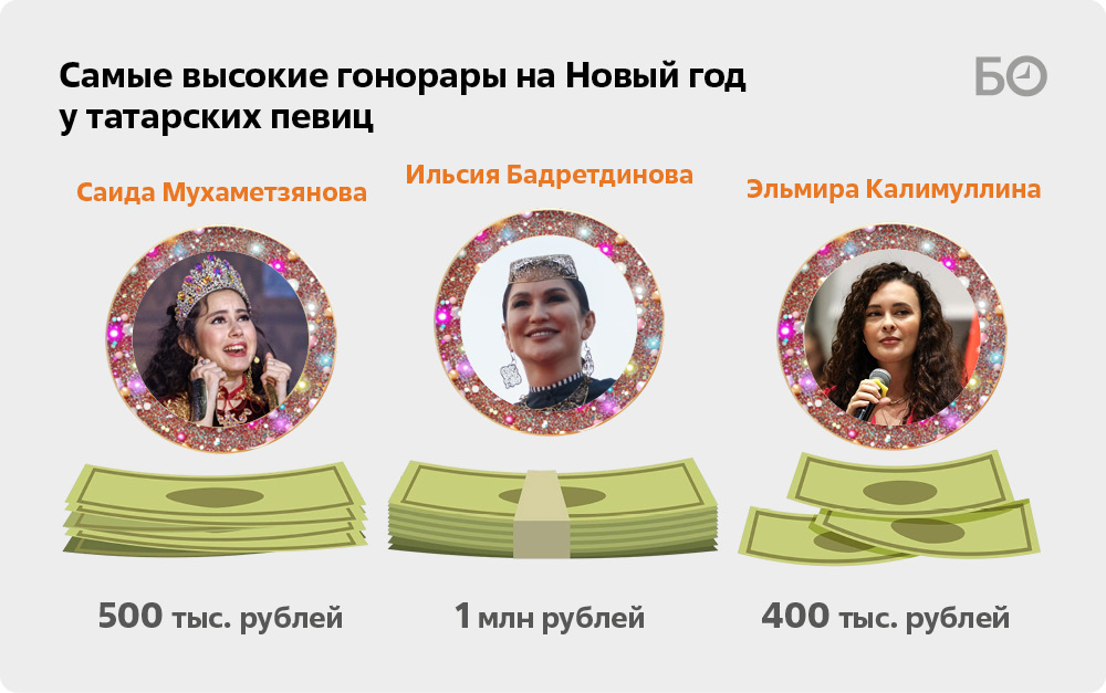 Не отстают от коллег по цеху и прекрасные представительницы татарской эстрады. Самым высоким ценником здесь, отмечают спикеры, может похвастаться Ильсия Бадретдинова — ее новогодние гонорары варьируются от 800 тыс. до 1 млн рублей. Еще в прошлом году эти цифры были куда скромнее: без коллектива мини-концерт заслуженной артистки Татарстана стоил 150 тыс., с коллективом — 350 тысяч. У главной татарской эстрадной певицы Гузель Уразовой нет гонорарного «среднего чека», все зависит от площадки, заказчика: это может быть и 100 тыс. рублей, и 300 тыс., при этом она бесплатно выступает и на благотворительных мероприятиях.