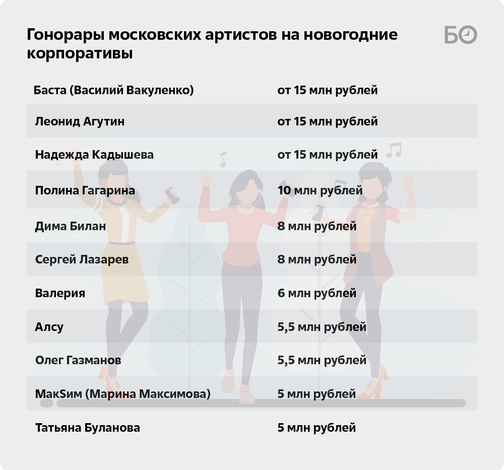 6 млн рублей за выступление на новогоднем корпоративе просит Валерия, плюс 12% от гонорара за наличный расчет. Лететь народная артистка России готова только бизнес-классом, причем обязательно в первом ряду и обязательно в сопровождении своего супруга — продюсера Иосифа Пригожина. С ними прилетит коллектив из 14 человек (музыканты, охрана и т. д.), которым достаточно эконом-перелета, также нужен CBBG для саксофона.