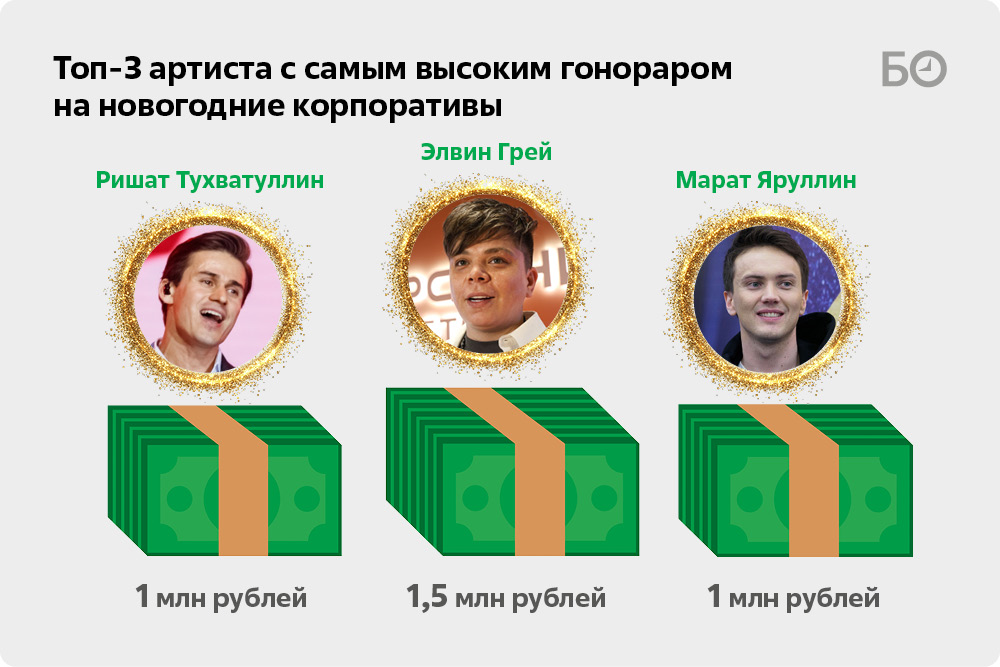 У кого самые большие гонорары на новогодние корпоративы в Татарстане? За народного артиста Башкортостана Элвина Грея (Радик Юльякшин) нужно будет отдать 1,5 млн рублей, если речь идет о почти полуторачасовом выступлении на новогоднем корпоративе. Но у него условия выступления, как и размер гонорара, остаются без изменений уже последние несколько лет. Выступает он с тремя музыкантами, среди технических требований — профессиональный звук и фоновый свет, сцена от 3 × 6 м, экран и полноценный свет (но это уже по желанию заказчика). Бытовые условия минимальные — только питьевая вода.