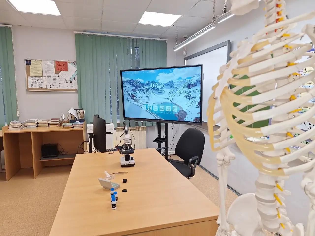В кабинетах биологии и химии установлены интерактивная панель, моноблок, лазерное многофункциональное устройство, электронный микроскоп, учебный анатомический скелет и демонстрационная таблица с периодической системой элементов Д.И. Менделеева. Новое оборудование повысит качество преподавания естественно-научных дисциплин, сделав уроки более наглядными и интерактивными.