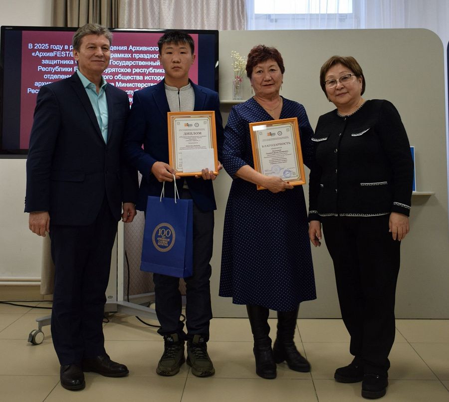 - Дипломом Победителя в номинации «Великая Отечественная война в истории моей семьи» награждается Санжиева Сарюуна Санжи-Митыповна, ученица 11 класса Кусотинской СОШ Мухоршибирского района с работой «Служебная характеристика моего прадеда». Руководитель Дашанимаева Алёна Баировна, учитель Кусотинской СОШ Мухоршибирского района.