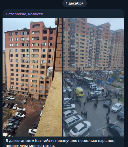 Украинские дроны атаковали Дагестан. Центром атаки стал город Каспийск, где повреждена многоэтажка. По словам местных жителей, было слышно несколько взрывов, один из самых мощных - в жилом секторе. Во многоквартирном доме выбило окна, часть кирпичей и оконных рам упали на парковку, пострадали полтора десятка машин.