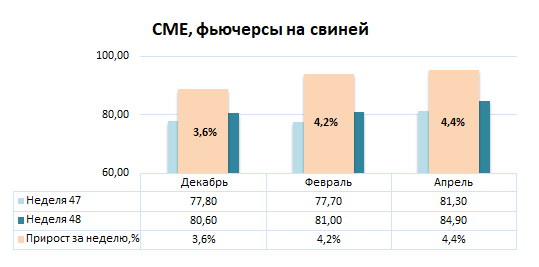 Фьючерсы на постную свинину на февраль — от 77,125 до 84,00 долларов США, с тенденцией к росту.