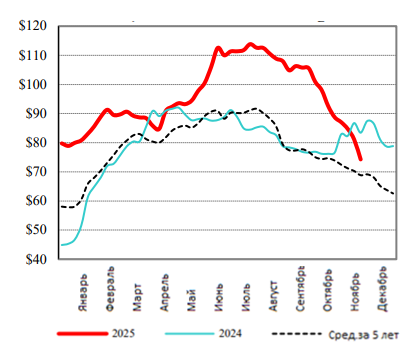 -ценовой диапазон ($) - средневзвешен. цена -Изменение по сравнению с днем ранее -объем продаж | 65,00-76,00 72,09 -1,48 1168 | Нет данных |