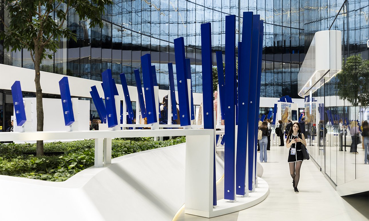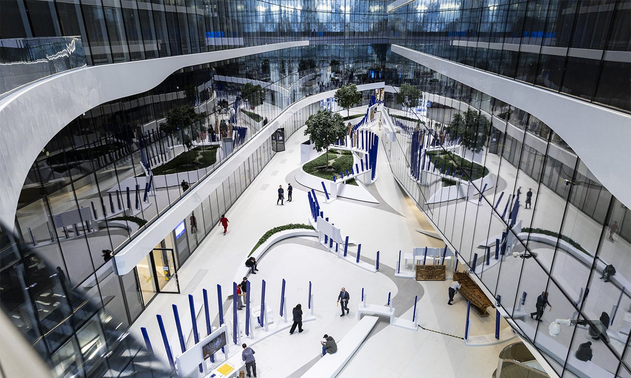 У самой площадки Лахта Центра, конечно, есть особенности: его атриум — общественное пространство со множеством траекторий движения, переходов, ограничений — от пожарных до антропогенной нагрузки. А мы замахнулись на огромную композицию — маршрут, который нельзя прервать. Так что ограничения были продиктованы логичными требованиями безопасности и эксплуатации пространства. Нам удалось найти баланс, сохранив идею. Удалось выдержать ритм даже на уровне ламелей, образующих волну, которые в определенный момент раздвигались для проходов, но ощущение непрерывности не терялось.