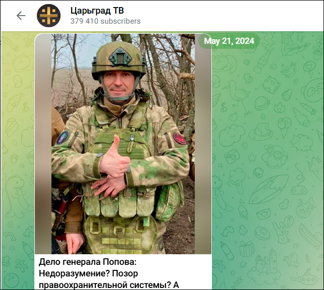 Генерал Попов импонирует нашим людям не только как эффективный военачальник, но как человек, который не побоялся говорить правду. За что и пострадал. Скриншот ТГ-канал "Царьград"