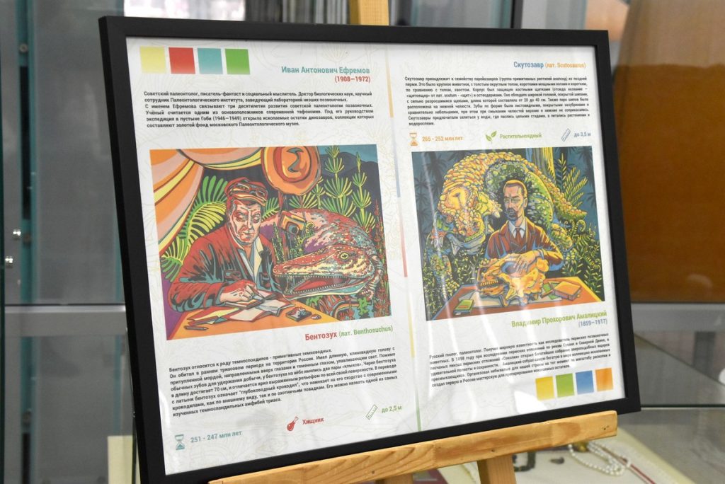 Гости также посмотрели выставку 12 картин из цикла «Лица российской палеонтологии» о палеонтологах и открытых ими животных. Автор – Надежда Липатова. Кроме того, ученики Школы креативных индустрий «оживили» эти картины.