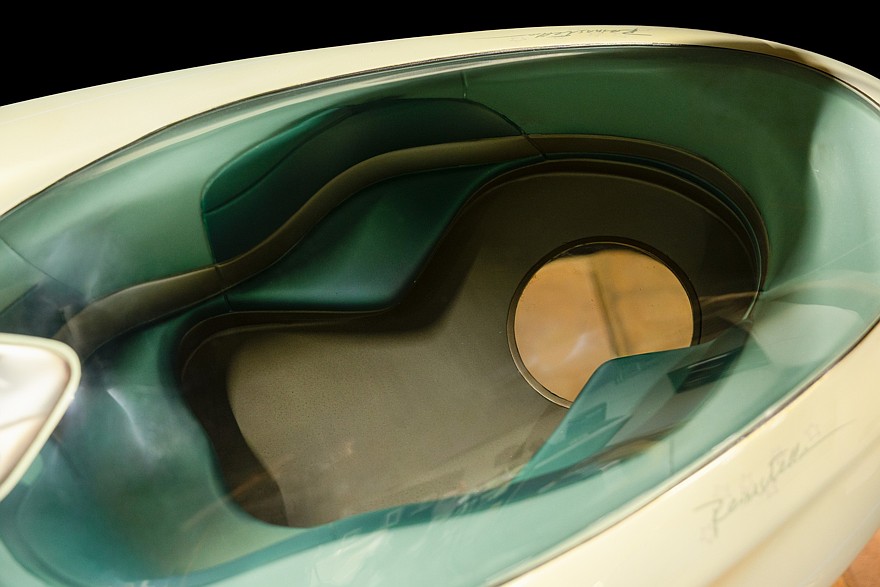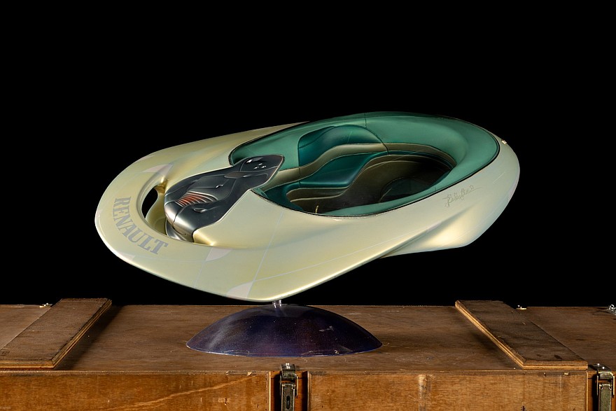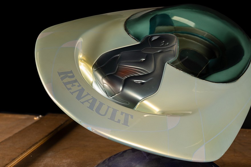 Одна из предположительно трёх моделей летающей тарелки, сделанная Renault для парижского Диснейленда. Вид немножко потасканный, но эффектный. В уютном салоне с фигурным диваном есть круглое смотровое окно в полу. Тарелка закреплена на шарнире, который позволяет задать ей нужное положение в пространстве.