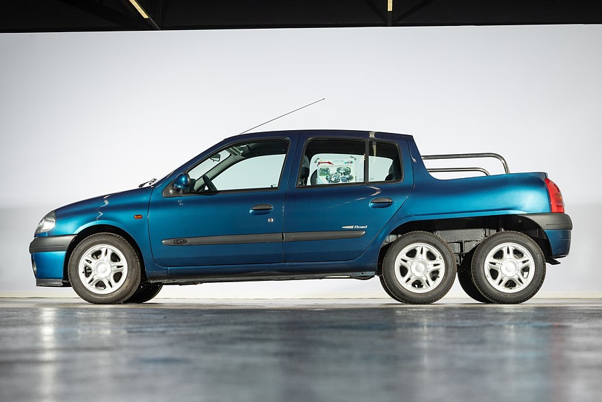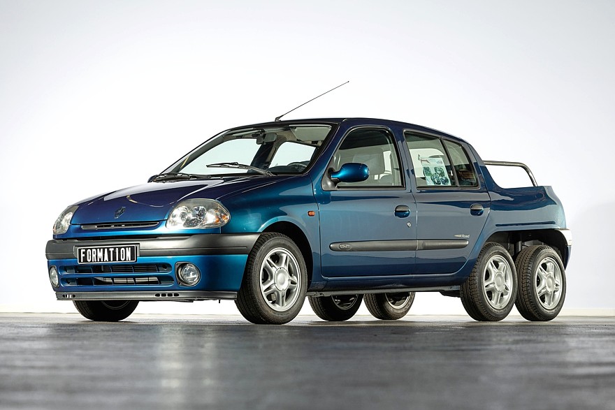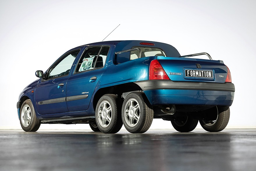 Шестиколёсный пикап на базе Renault Clio второго поколения — это учебный проект, изготовленный в качестве упражнения кузовными мастерами завода во Флинсе. Наращенная корма выглядит несколько аляповато из-за перепада высоты верхнего контура, третья ось добавлена для увеличения грузоподъёмности, хотя никаких серьёзных грузов этот пикап не возил. Машина находится на ходу, но из-за её кустарной конструкции езда возможна лишь на низких скоростях. Под капотом установлен турбодизель, мощность в карточке лота не указана, но для справки скажем что серийные дизельные версии Clio второго поколения располагали мощностью от 64 до 101 л.с.