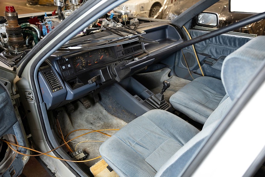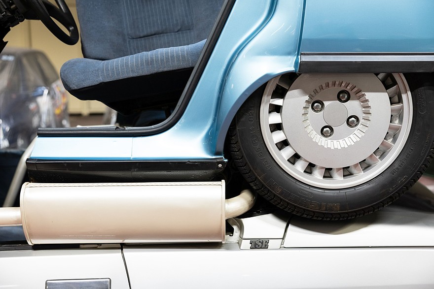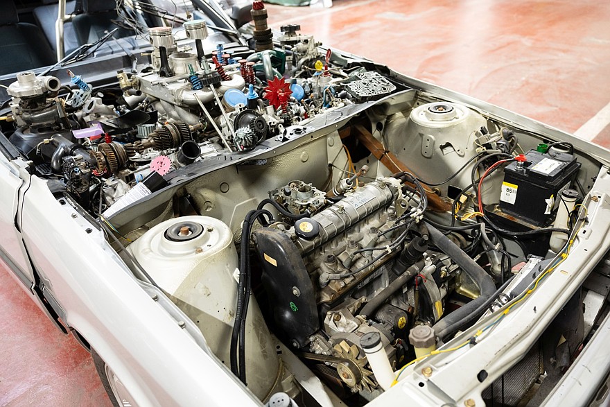 Это выглядит как полное безумие, но так и было задумано. Уинкальный Renault 21 был сделан для фильма «Леви и Голиаф» режиссёра Жерара Ури, вышедшего в прокат в 1987 году. Фильм повествует о незадачливом молодом человеке, втянутом в наркоторговлю. По сюжету фильма, алмазный порошок, который поставлялся как техническое сырьё на завод Renault в Курбевуа (это тоже пригород Парижа), заменён на схожее ко консистенции наркотическое вещество, оно попадает на конвейер, одурманивает рабочих, в результате чего они собрали показанного на фотографиях монстра с несколькими наслаивающимися друг на друга дверями и двумя кабинами, расположенными одна над другой, причём руль находится на втором этаже, а коробка передач и педали — на первом, то есть для управления нужны минимум два человека. За основным капотом с двигателем находится второй открытый моторный отсек с месивом из различных деталей и механизмов. Короче говоря, боди-хоррор из 1980-х в приложении к автомобилям выглядит именно так.