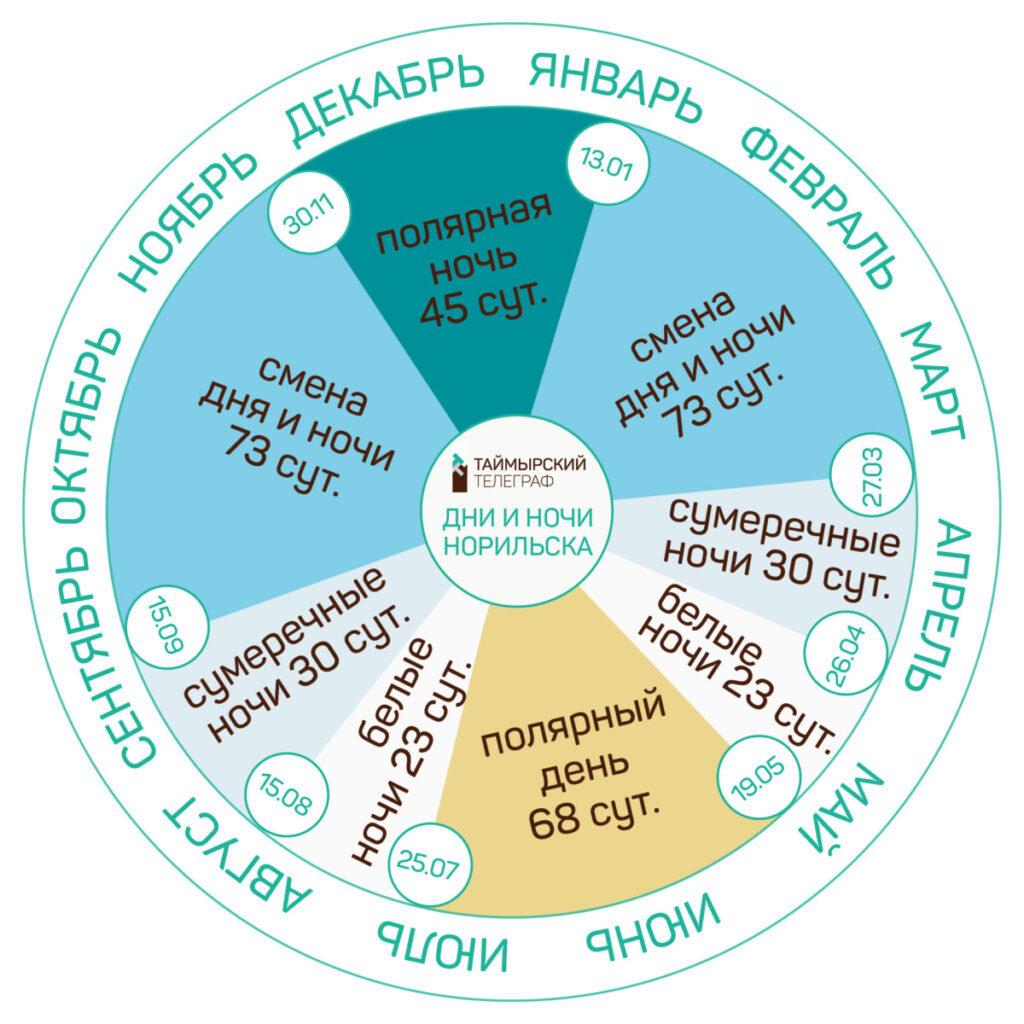 Как пишет «Таймырский телеграф», жители Норильска ориентируются на «вечный календарь полярных дней и ночей» – диаграмму, составленную по материалам Николая Урванцева. Метеорологи считают ее не абсолютно верной, но она удобно и наглядно демонстрирует график смены световых режимов в Норильске.
