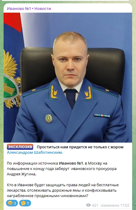 Богатый на кадровые перестановки день продолжил новостью о возможном повышении областного прокурора Андрея Жугина. Соответственно он покинет 37-й регион.
