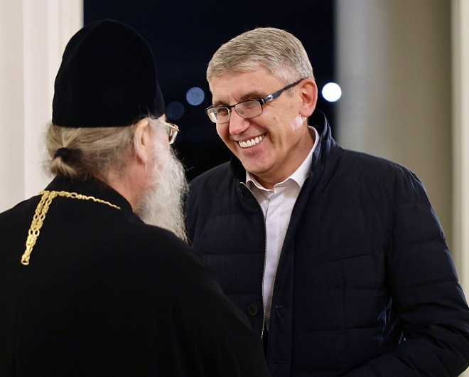 Тульский губернатор поблагодарил владыку Кирилла за теплый прием на Казанской земле. На молитвенную память Дмитрий Миляев передал храму-памятнику икону великомученика Георгия Победоносца. Протоиерей Владимир Самойленко преподнес губернатору Тульской области образ Спаса Нерукотворного.