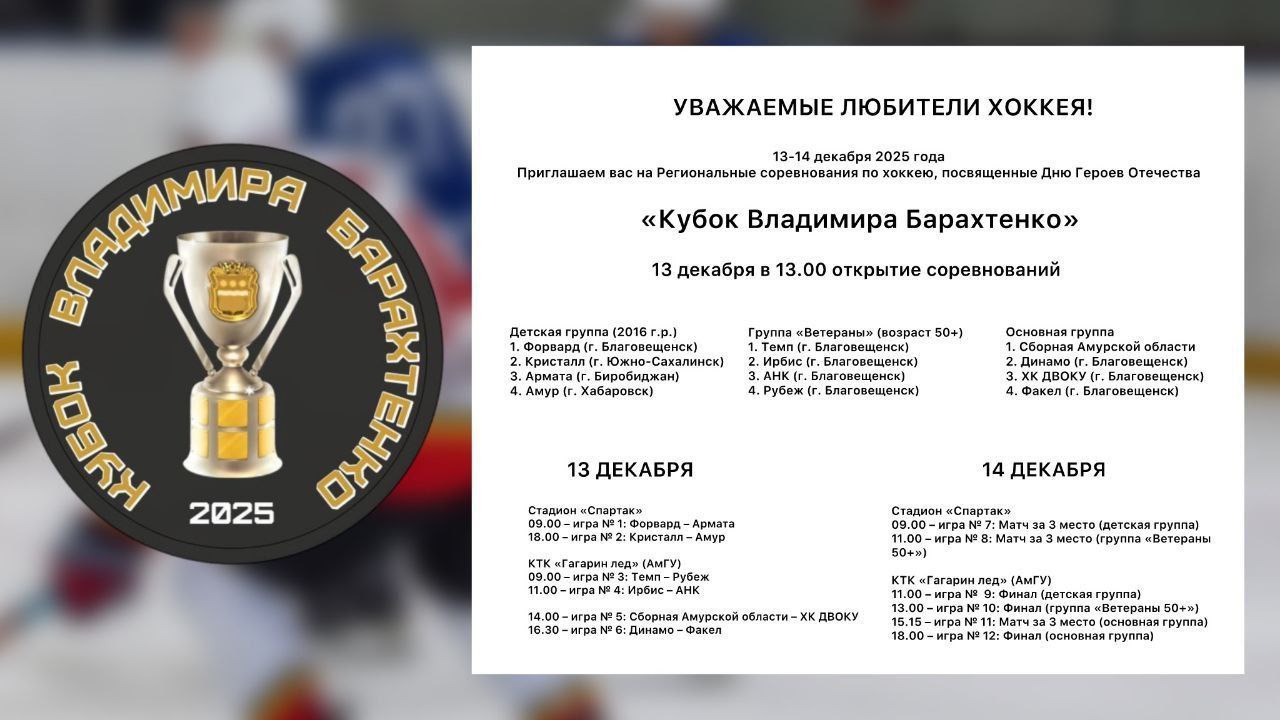 В столице Приамурья в третий раз пройдет региональный турнир по хоккею с шайбой «Кубок Владимира Барахтенко». В трех группах сыграют детские, мужские команды и коллективы ветеранов спорта (50+). Матчи пройдут на ледовой арене «Спартак» и новом крытом катке «Гагарин лед» в АмГУ.