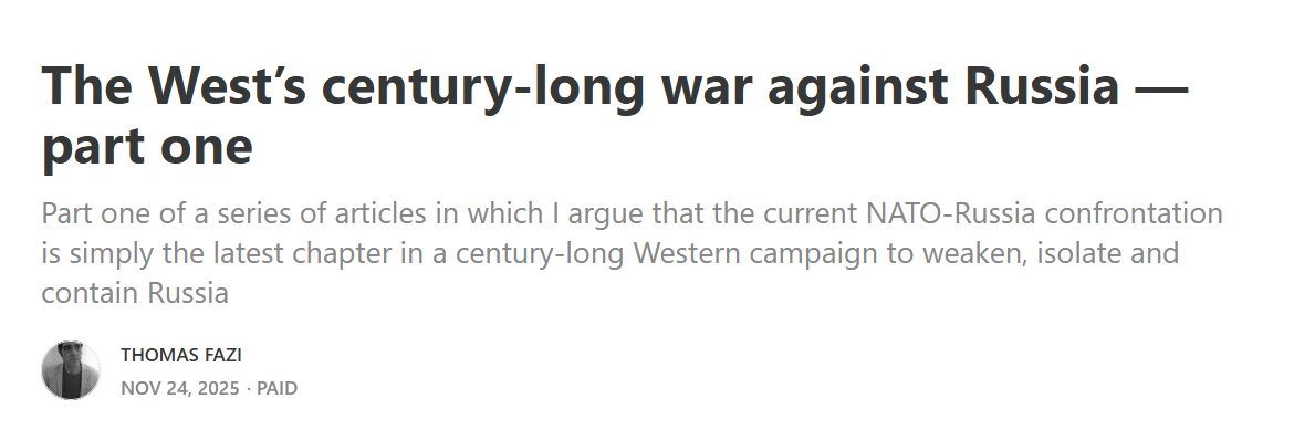 В своей недавней статье на платформе Substack Фази подчёркивал, что нынешняя конфронтация Североатлантического альянса с Москвой — лишь продолжение «вековой кампании Запада по ослаблению, изоляции и сдерживанию России».
