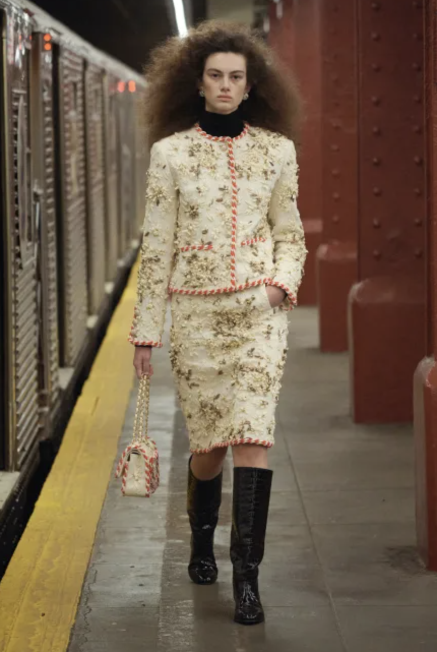 Чего только не увидишь в нью-йоркском метро! 2 декабря, например, на закрытой станции Бауэри прошел показ второй коллекции Матье Блази для Chanel — Métiers d’Art. Это ежегодное шоу, созданное по инициативе Карла Лагерфельда в начале 2000-х. Оно проводится каждый декабрь, чтобы отдать дань уважения небольшим мастерским, с которыми сотрудничает модный дом.