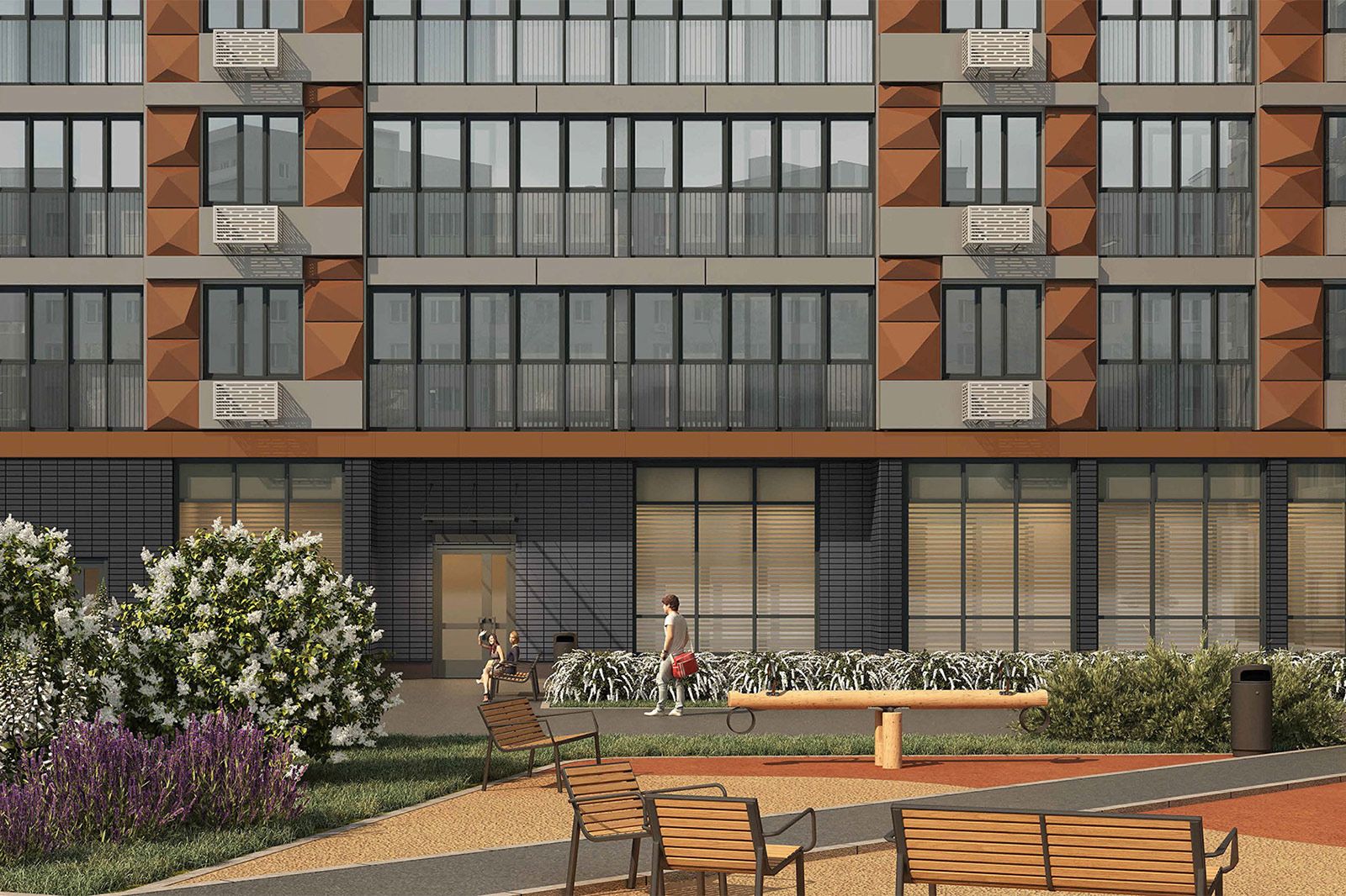 Рядом с домом обустроят две детские и спортивные площадки, организуют места для отдыха с лавочками. Во дворах появятся тротуары, бетонная плитка перед подъездами, а также плоскостная парковка.