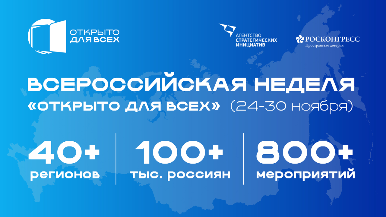 Более 100 тысяч россиян в 44 регионах приняли участие в 820 мероприятиях Всероссийской недели «Открыто для всех» 24-30 ноября. События недели были направлены на улучшение качества жизни людей с инвалидностью, а также формирование в обществе более глубокого понимания их потребностей и создание равных возможностей для всех.