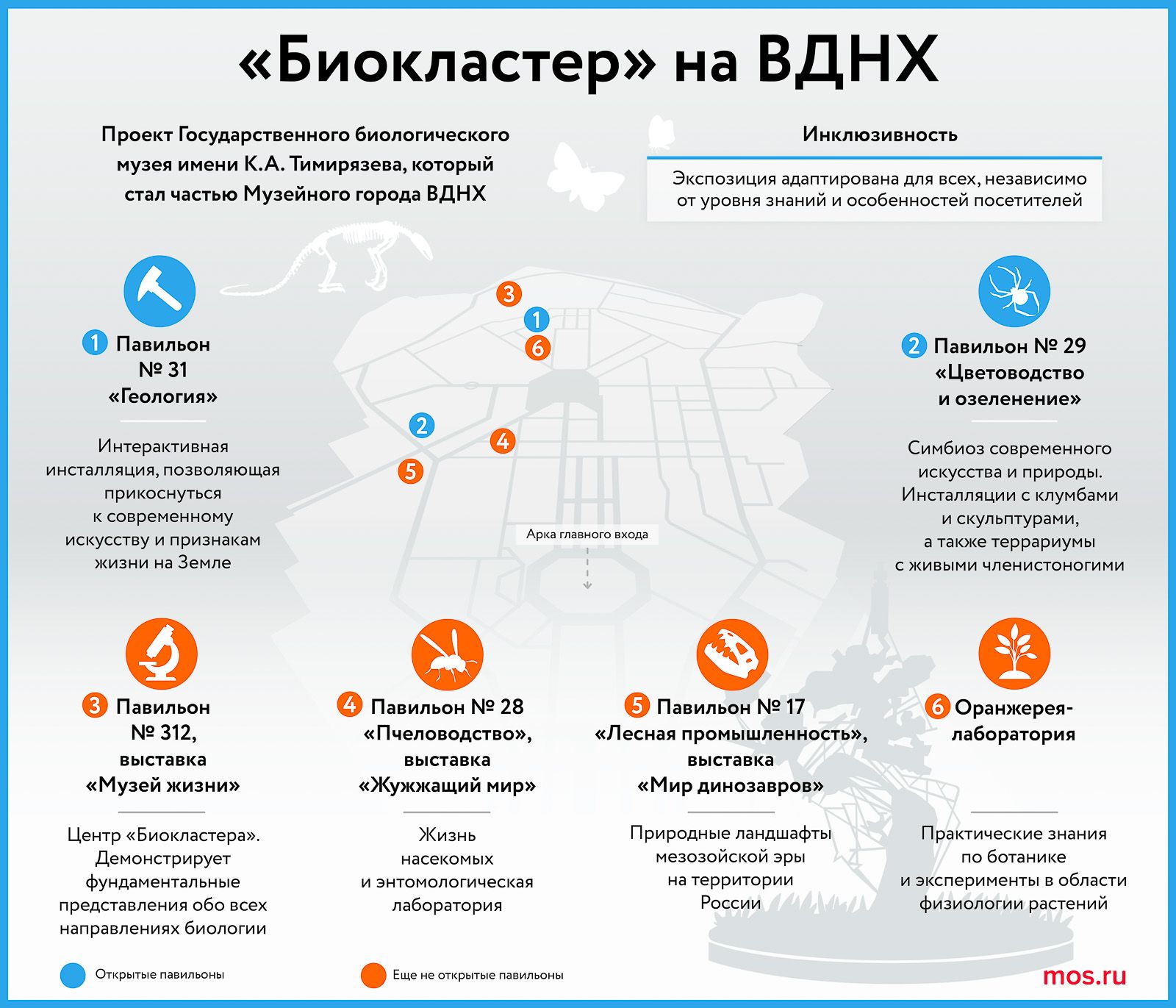 Проект «Биокластер» меняет представление о том, каким должен быть современный музей, и обещает сделать науку не просто доступной, а по-настоящему захватывающей. «Биокластер» был запущен в июне этого года, сегодня в рамках проекта работают два павильона с выставками, организованные при поддержке Департамента культуры Москвы, — № 31 «Геология» и № 29 «Цветоводство и озеленение».