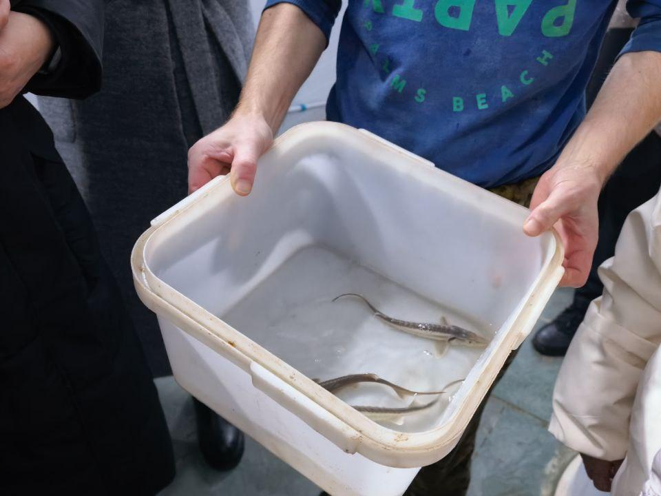 Гости увидели, как в специальных садках вырастают крупные особи, поинтересовались технологией кормления и условиями содержания рыбы.