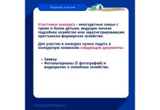 К участию приглашаются многодетные семьи, воспитывающие трех и более детей, ведущие личное подсобное хозяйство. Чтобы принять участие, необходимо прислать 5 фотографий и видеоролик о семейном хозяйстве.