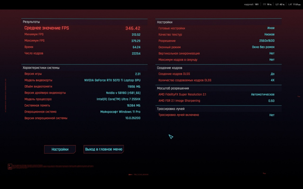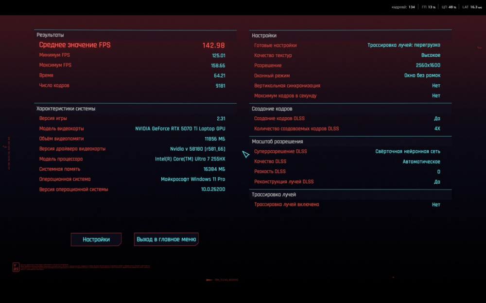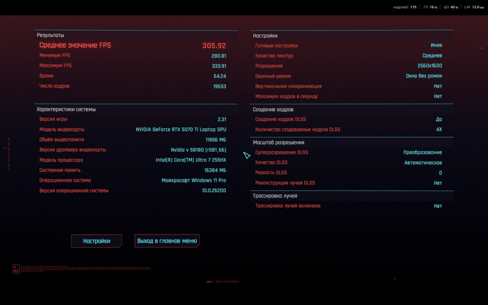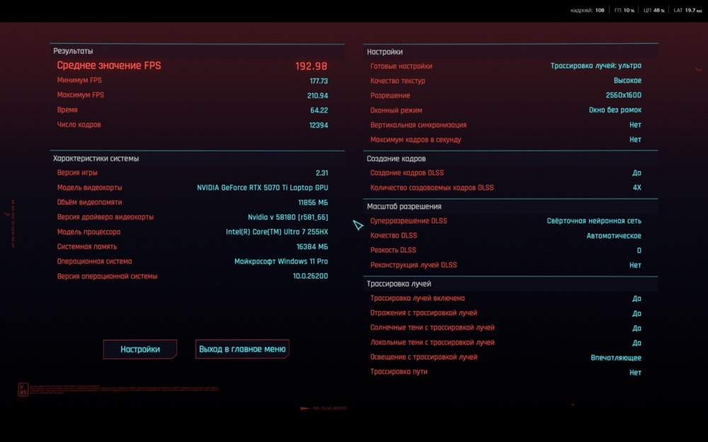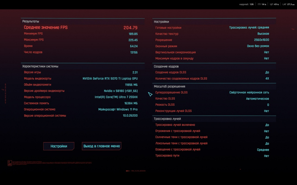 На скриншотах ниже вы сможете ознакомиться с результатами встроенного бенчмарка в игру Cyberpunk 2077.