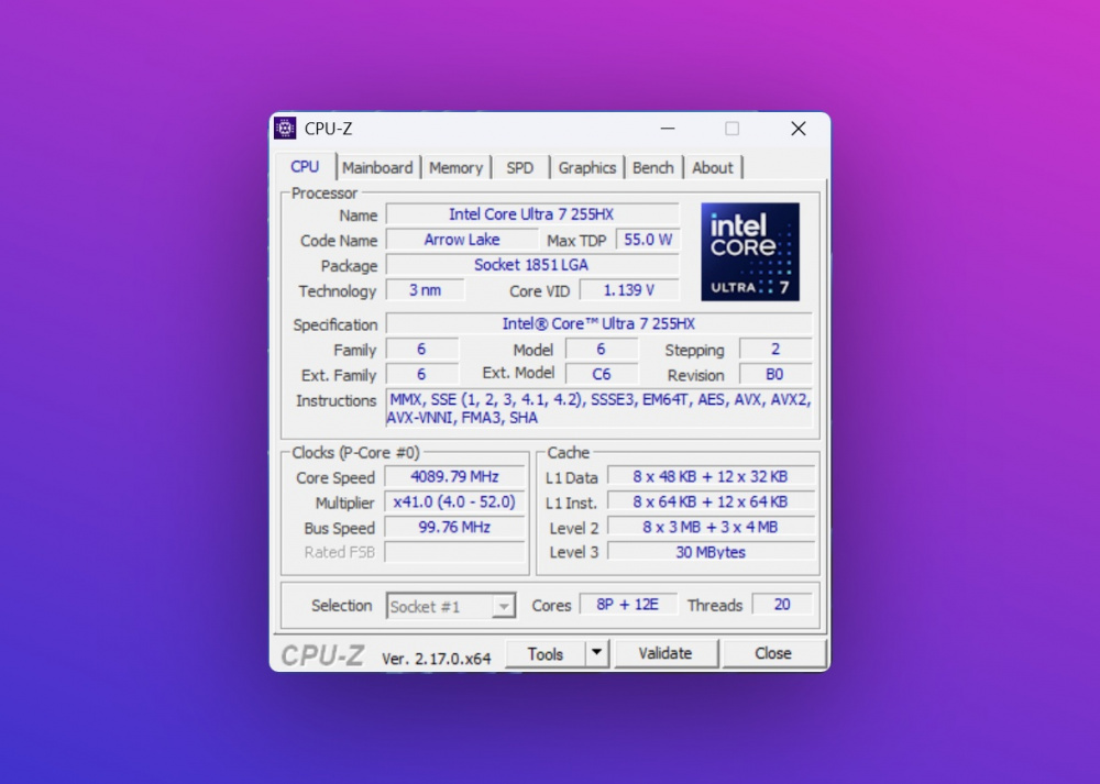 - Процессор: Intel Core Ultra 7 255HX 2,4 ГГц (кэш 30 МБ, до 5,2 ГГц, 20 ядер [8P/12E], 20 потоков); Intel AI Boost NPU до 13 TOPS