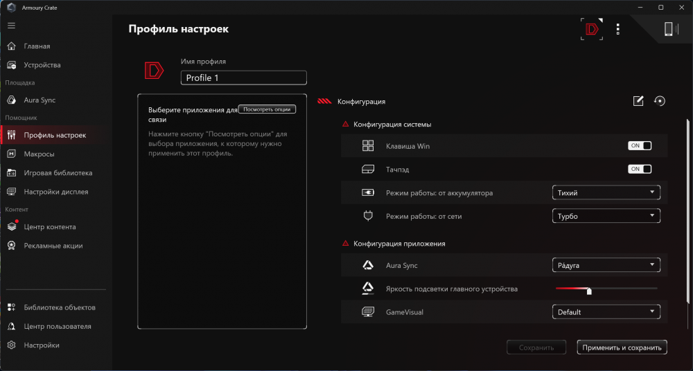 Главный центр управления — Armoury Crate. Здесь настраивается подсветка, профили охлаждения, сеть, управление Panel Overdrive, мониторинг вентиляторов, обновления BIOS и драйверов.