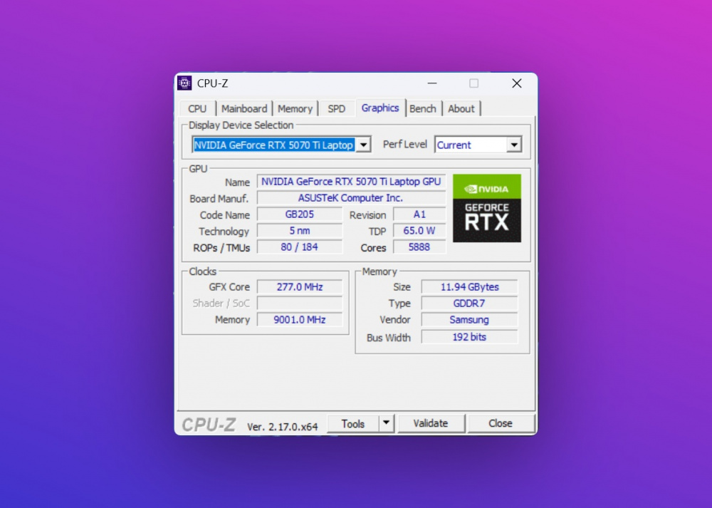 - Видеокарта: NVIDIA GeForce RTX 5070 Ti для ноутбуков, ROG Boost: 1565 МГц при 140 Вт (1515 МГц Boost + 50 МГц OC, 115 Вт + 25 Вт Dynamic Boost), 12 ГБ GDDR7