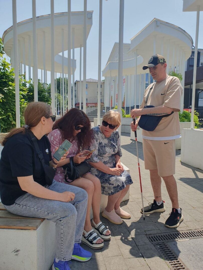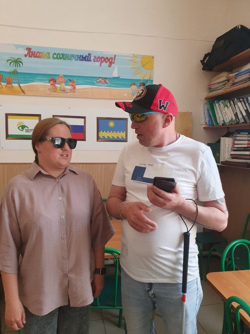 Утром они с группой работали в помещении, а днем все вместе ходили по городу, учились с помощью универсального помощника читать вывески и делать фотографии на море. Для плохо видящего человека, который ориентируется на улицах только с привычной тростью, поначалу было удивительно, когда при помощи специальной функции на телефоне ему объясняли, где найти вход в аптеку или магазин, буквально помогая войти в дверной проем. Вот так теорию поверяли практикой.