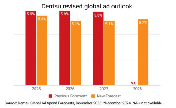 Dentsu понизила прогноз роста мирового рекламного рынка на 2026 год, отметив влияние макроэкономических факторов и перехода индустрии в «алгоритмическую эру». По данным обновленного отчета, глобальные расходы на рекламу впервые превысят $ 1 трлн долларов, однако темпы увеличения скорректированы почти на один п.п.