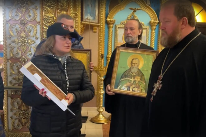 В Свято-Покровском соборе Лира Бурак вручила настоятелю отцу Алексею иконы Святого Иоанна Кронштадтского, Святого преподобного Сергия Радонежского и Тихвинской Божией Матери, которые стали символом поддержки и укрепления духовных связей, дружбы и сотрудничества между Всеволожским районом и подшефным городом Енакиево.