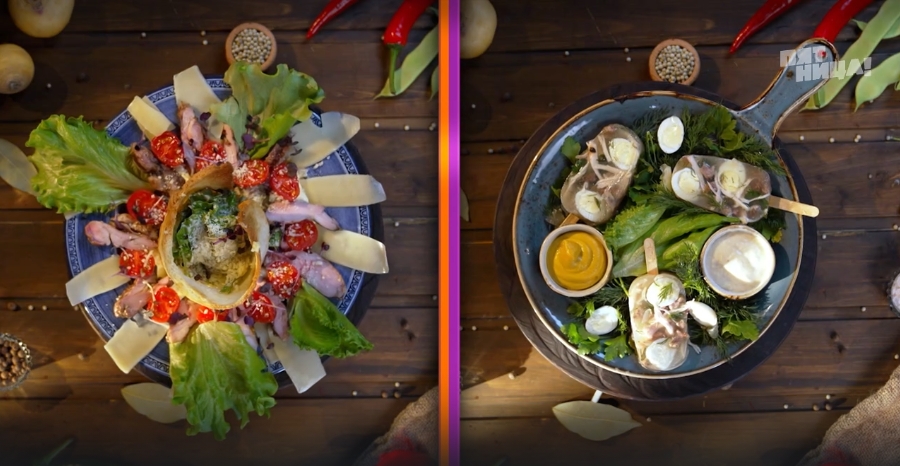 На дегустацию шеф-поварам Никита Кравченко представил салат «Цезарь» и «Мужское эскимо» – холодец в форме мороженого, выполненные в фирменной подаче. По итогам кастинга тагильчанин был принят в команду Рената Агзамова.