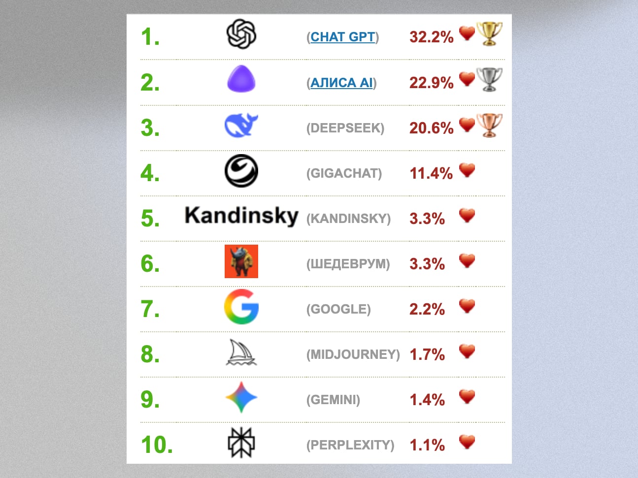 Также в этом году OMI впервые выпустила рейтинг любимых нейросетей в России. Первое место в нём удерживает ChatGPT, следом за ним расположились Алиса AI и DeepSeek.